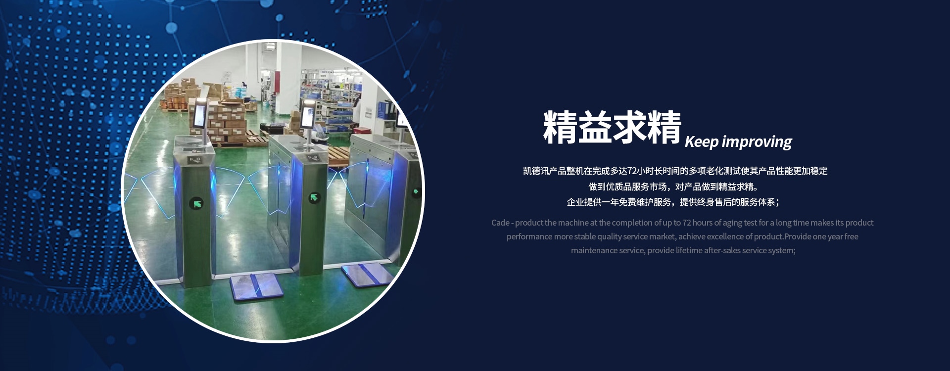 深圳市凱德訊科技有限公司成立于2003年,注冊資本500萬元,位于港珠澳大灣區(qū)的深圳市,公司集研發(fā)、生產(chǎn)、銷售電子行業(yè)防靜電門禁系統(tǒng)和民用智能通道系統(tǒng)的綜合性企業(yè)。公司擁有自主產(chǎn)權(quán)的產(chǎn)品并一直致力于ESD門禁系統(tǒng)、智能安防門禁系統(tǒng)、景區(qū)通道閘機、人臉識別閘機、消費系統(tǒng)、智能翼閘的研發(fā)生產(chǎn)與銷售。凱德訊目前擁有多款功能齊全的系統(tǒng)軟件及多款硬件產(chǎn)品,包含成型加工、機芯研發(fā)、軟件開發(fā)等技術(shù)均為本公司自主研發(fā)、獨立完成。14年來,凱德訊一直秉承以用戶需求為核心,穩(wěn)定、實用、智能的產(chǎn)品是我們開拓市場的基石,務(wù)實進取的精神是我們孜孜不倦的追求,全方位真誠的服務(wù)是我們對您永恒的承諾。